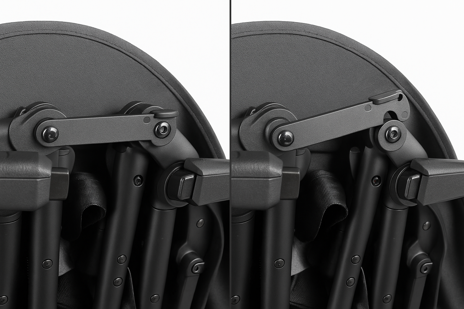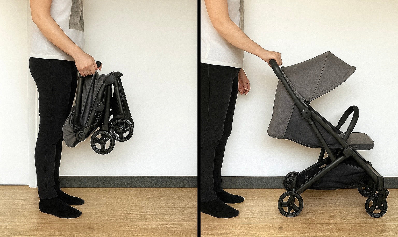 Un clic suffit pour plier ou déplier la poussette. Mécanisme fluide pour un usage rapide au quotidien.